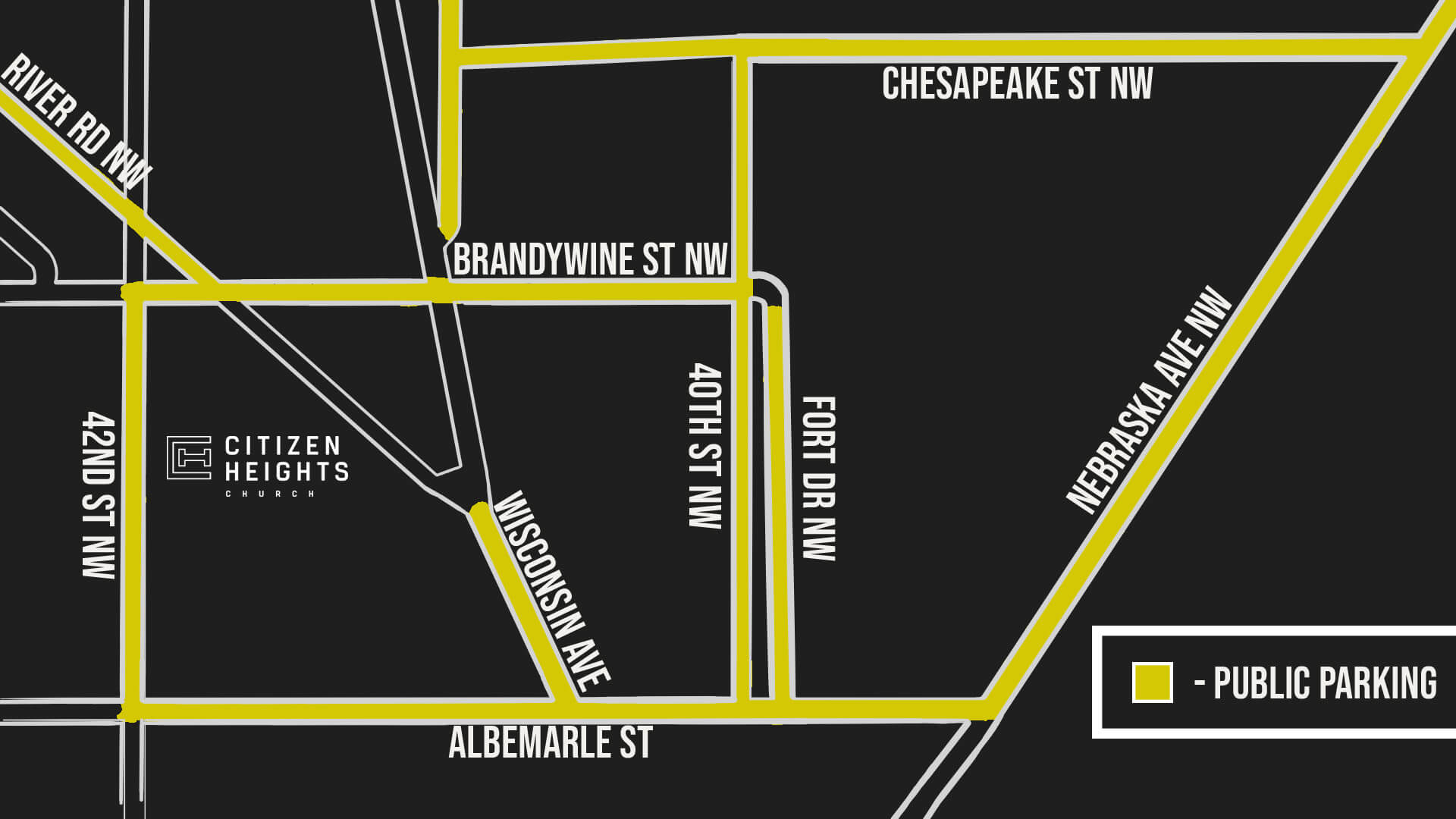 1. Street parking is available all around our campus. Yellow areas denote parking.